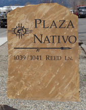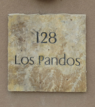 Another unique set of products we provide are signs and markers made from stone products. Signs or markers start with a slab, tile or monolith of an appropriate size and are then sandblasted to engrave text, images or motifs to the desired depth. These engraved letters and shapes can then be finished to smooth them out or left in various degrees of roughness. Once the desired finish has been achieved we can paint or stain engraved areas prior to sealing to create visual emphasis or to bring out complex patterns by using different colors or leaving some areas their natural color. Areas left like this are usually several shades lighter or darker than the surrounding stone due to different colored strata in the stone exposed in the process and the surface texture. These can be used for a number of purposes, including business signs, street addresses, room numbers indicators, memorial markers or any other purpose where a unique and eye catching text display would be desired. Slabs and monoliths especially have incredible visual mass and confer an aesthetic of timeless stability and high quality, as well as extreme durability. Monolithic blocks can be finished in much the same way as slabs and tiles to similar affect.