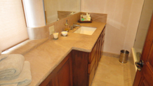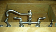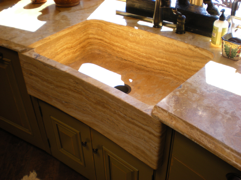 One of our newer and more popular products, Monolithic Carved Sinks are hand carved out of one solid piece of slab to create a unique and seamless affect. Sinks are carved out of slabs between 4" to 18" in depth and can be carved in a number of different styles and sizes; traditional farm sinks, kitchen sinks, trough sinks, round sinks and slot sinks can all be made in this fashion. Carved sinks can be joined to a slab top for extra depth or the sink can be carved into a full slab of standard size (maximum slab size varies slightly by material type). Outside of a 1" to 2" diameter offset from the interior of the bowl, we can gauge the slab down to a 1-1/4" thickness at minimum everywhere else creating a seamless sink in a countertop or vanity that will fit into cabinetry but still appear as thick as a normal slab. Slot sinks tend to accentuate modern architectural styles, traditional bowls classical and trough sinks both. Please note that since the drain hardware is mounted invisibly under the slot in a pocket, Slot Sinks *CAN'T* be stopped up for hygienic reasons; this makes slot sinks most appropriate for non-kitchen applications. If you want a stone sink that is outside the maximum dimensions for slab thickness (varies by material from 6" - 20" in depth), we have special equipment to make nearly seamless miter joints and can laminate slab material into farm sinks or trough sinks of certain styles. Additionally, carved sinks and laminated sinks can be closely joined to a countertop to give extra depth.
