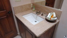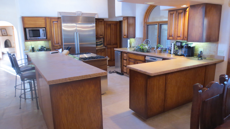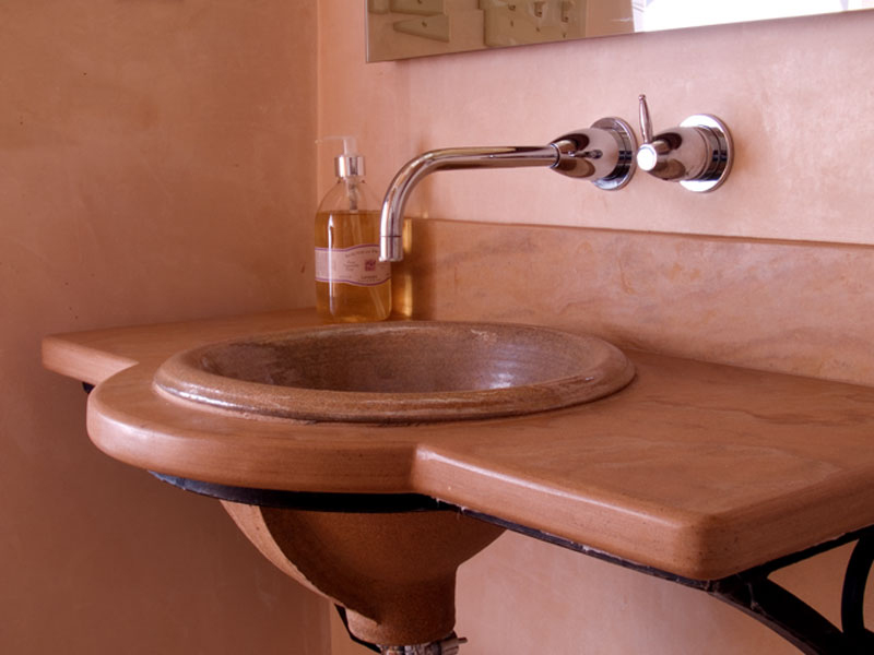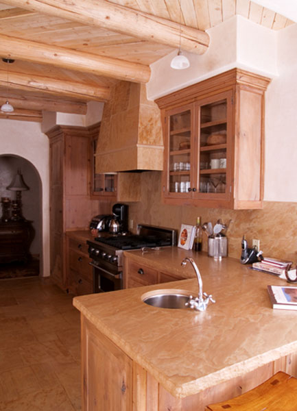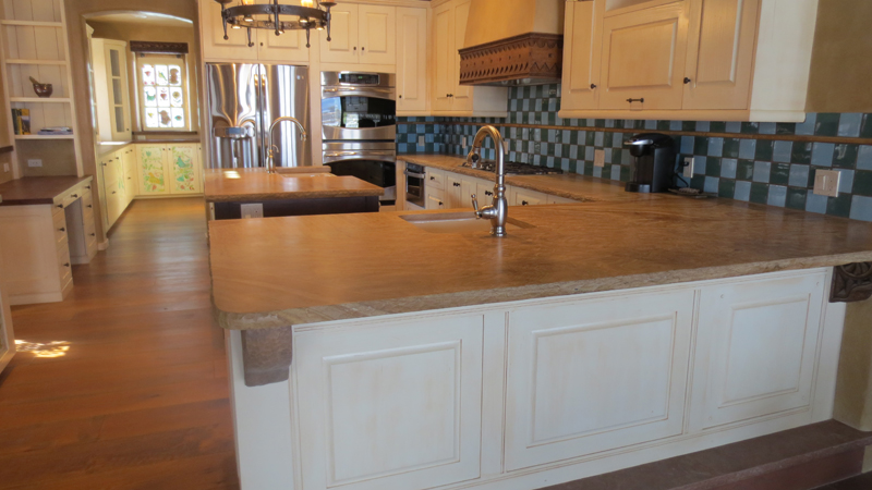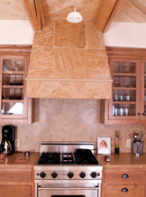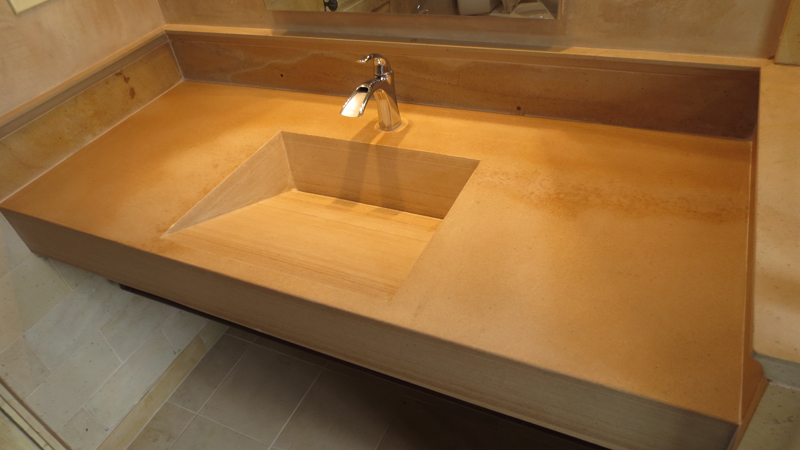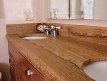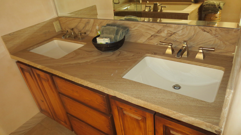 Sandstone & Limestone countertops have traditionally been one of our primary products and produce a completely unique appearance unmatchable by traditional stone products suck as marble, granite or synthetic materials. Depending on the type of material chosen and the finish, sandstone tops can be made to complement or contrast living materials due to the unique grain and movement or create a sleek modern look. Unless constrained by building requirements, all of our countertops are 1-1/2" to 3" thick when viewed from the edge; this thickness creates a sense of mass and solidity that thinly sliced mass produced stone products can never achieve. By strategically applying slab work sparingly, the value of a house can be greatly increased relative to the total cost. Additionally, slabs can be carved out over cabinetry or mirrored strips from the same slab can be laminated around the edges to create the appearance of a much thicker slab without the weight of a full thickness slab. Please see edge profiles page under materials for examples of how edges can be milled and finished to create various appearances to match your desired architectural style. Third party sinks can be installed in rabbited pockets so that they seamlessly undermount into a slab near the surface instead of at the base; also see the carved sinks above for examples of monolithic vanities with integrated sinks. For large applications, slabs can be joined together in a number of fashions to create arbitrarily large installed pieces of a desired dimension. Please see our finishes page for details on how slab materials can be made to varying finished appearances tailored to your application.